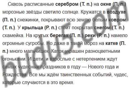 Сквозь расписанные (серебро) на (окно) морозные звёзды светило солнце. Кружатся в (воздух) снежинки, покрывают всю землю белым (ковёр). У (крыльцо) стоит покрытая (снег) скамейка. На крутых (берег) (река) намело огромные сугробы. Но даже в такой мороз на (каток) много мальчишек. Каток украшен разноцветными огоньками. И дети, и взрослые с нетерпением ждут самых чудесных праздников в году — Нового года и Рождества. Все мы ждём таинственных событий, чудес, которые случаются в это время.