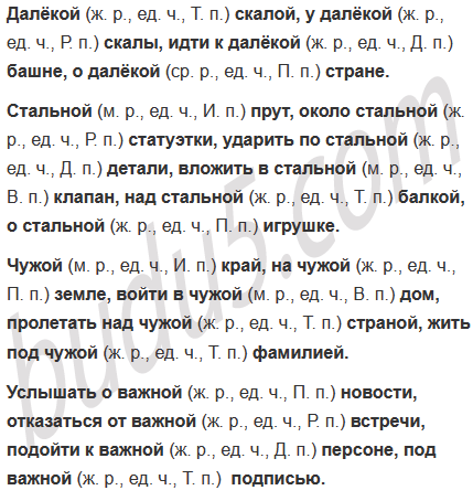 Образец. Родной (м. р., ед. ч., И. п.) край, у родной (ж. р., ед. ч., Р. п.) матери, с родной (ж. р., ед. ч., Т. п.) стороной, подарить родной (ж. р., ед. ч., Д. п.) сестре, о родной (ж. р., ед. ч., П. п.) земле.
