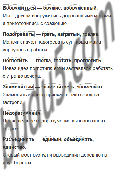 Вооружиться, подогревать, поглотить, (глотка), знаменитый (ист.: от знамя, букв. "ознаменованыый"), недоразумение (ист.: разум), разъединять (единый).