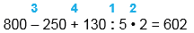 800 - 250 + 130 : 5 • 2 = 602