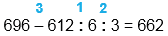696 - 612 : 6 : 3 = 662