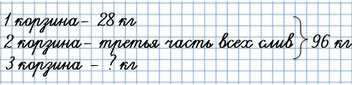 29. В трёх корзинах 96 кг слив. В первой корзине 28 кг, во второй - третья часть всех слив. Сколько килограммов слив в третьей корзине?