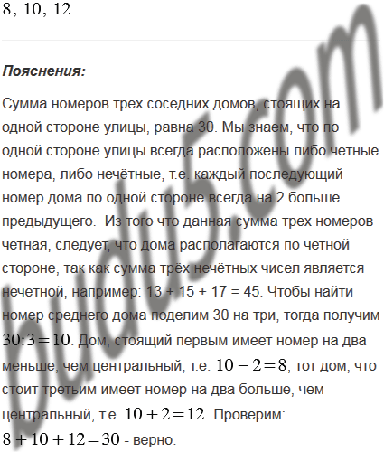 Сумма номеров трёх соседних домов, стоящих на одной стороне улицы, равна 30. Какие номера имеют эти дома?