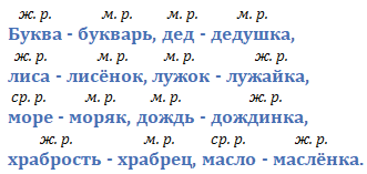 Оля (ж. р.) - Оленька (ж. р.), море (ср. р.) - моряк (м. р.), дед (м. р.) - дедушка (м. р.), лиса (ж. р.) - лисёнок (м. р.), лужок (м. р.) - лужайка (ж. р.), дождь (м. р.) - дождинка (ж. р.), поле (ср. р.) - полюшко (ср. р.), метель (ж. р.) - метелица (ж. р.).