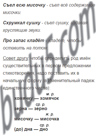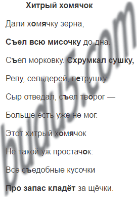 Объясняем орфограммы. Хомячку́ (хомячок) (букву о - необходимо запомнить; букву я - хомя́к), съел, съедобные (разделительный ъ), петрушку, творог (словарные слова), простачок (простачка), кладё́т (перекла́дывать).