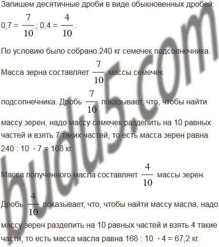 Было собрано 240 кг семечек подсолнечника. Сколько подсолнечного масла можно изготовить из собранных семечек, если масса зерна составляет 0,7 массы семечек подсолнечника, а масса полученного масла - 0,4 массы зерна?