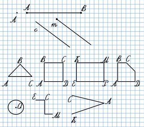 Точка (А), отрезок (АВ), прямая (с), луч (m), треугольник (ABC), квадрат (ABCD), прямоугольник (EKMP), многоугольник (ABCD), окружность (круг), ломаная (ECM), угол (CAK).