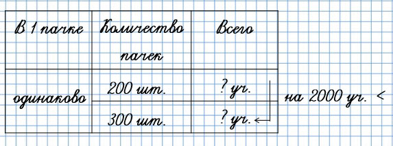 11. В два района отправлены учебники одинаковыми пачками: в один - 200 пачек, а в другой - 300 пачек. Сколько учебников отправлено в каждый район, если в первый район отправили на 2 000 учебников меньше, чем во второй?