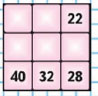 40 + 32 + 28 = 100 - сумма в каждой строке, каждом столбце и из угла в угол.