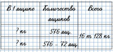 16 т 128 кг рассчитывали уложить в 576 ящиков. Вычислим, сколько килограммов яблок помещается в меньший ящик: