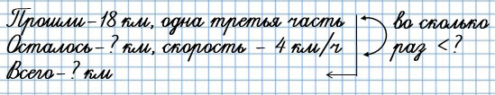 32. Туристы прошли 18 км, что составило третью часть всего их пути. Какое расстояние должны пройти туристы? Во сколько раз расстояние, которое они прошли, меньше оставшегося пути? Сколько времени они затратят на оставшийся путь, если будут идти со скоростью 4 км/ч?