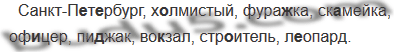 Санкт-П..т..рбург, х..лмистый, фура..ка, ск..мейка, оф..цер, пи..жак, во..зал, стр..итель, л..опард.