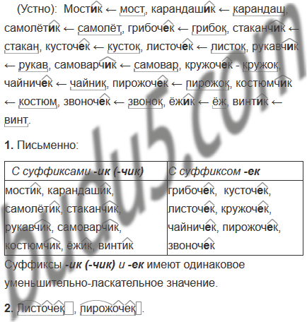 1. Выпишите существительные в два столбика: а) с суффиксами -ик (-чик), б) с суффиксом -ек. Выделите эти суффиксы. Подумайте какое общее значение объединяет слова с суффиксами -ик (-чик) и -ек.