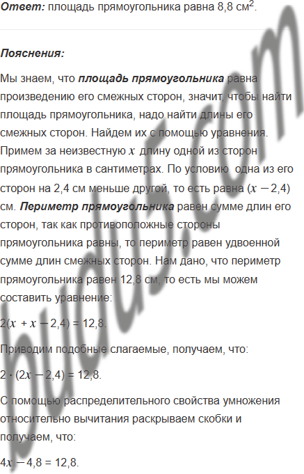 Периметр прямоугольника равен 12,8 см, а одна из его сторон на 2,4 см меньше другой. Найдите площадь прямоугольника.