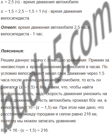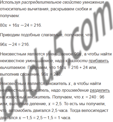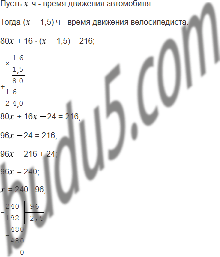 Из села в направлении города выехал мотоциклист со скоростью 80 км/ч. Через 1,5 ч из города в село выехал велосипедист со скоростью 16 км/ч. Сколько часов ехал до встречи каждый из них, если расстояние между городами и селом равно 216 км?