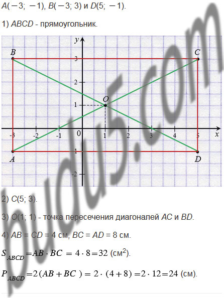 3) Найдите координаты точки пересечения диагоналей прямоугольника.