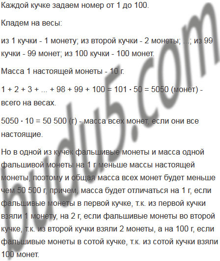 Есть 100 кучек по 100 монет. Одна из кучек состоит из фальшивых монет, каждая из которых на 1 г легче настоящей. Вес настоящей монеты составляет 10 г. Какое наименьшее количество взвешиваний на пружинных весах со стрелкой надо сделать, чтобы найти кучку из фальшивых монет?