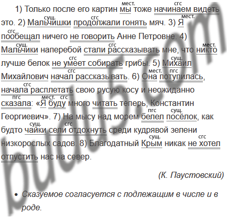 1) Только после его картин мы тоже начинаем видеть это. 2) Мальчишки продолжали гонять мяч. 3) Я пообещал ничего не говорить Анне Петровне. 4) Мальчики наперебой стали рассказывать мне, что никто лучше белок не умеет собирать грибы. 5) Михаил Михайлович начал рассказывать. 6) Она потупилась, начала расплетать свою русую косу и неожиданно сказала: «Я буду много читать теперь, Константин Георгиевич». 7) На мысу над морем белел посёлок, как будто чайки сели отдохнуть среди кудрявой зелени низкорослых садов. 8) Благодатный Крым никак не хотел отпустить нас на север.