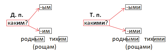 Имена прилагательные в форме дательного падежа множественного числа имеют окончания: -ым, -им; а в форме творительного падежа множественного числа имеют окончания: -ыми, -ими.
