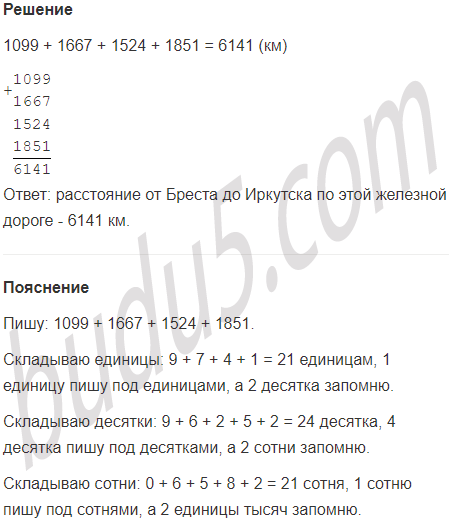 Задание № 6. По железной дороге от Бреста до Москвы 1099 км, от Москвы до Екатеринбурга - 1667 км, от Екатеринбурга до Новосибирска - 1524 км, а от Новосибирска до Иркутска - 1851 км. Чему равно расстояние от Бреста до Иркутска по этой железной дороге?