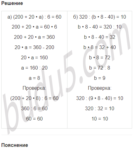 | а) (200 + 20 • а) : 6 = 60 | б) 320 : (b • 8 - 40) = 10 |