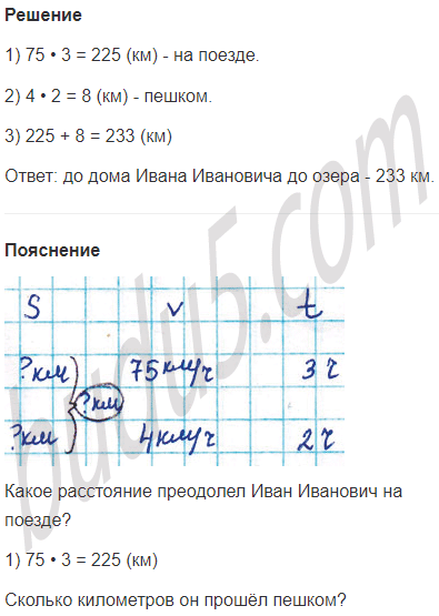 Задание № 5. Иван Иванович отправился из дома на озеро Медвежье ловить рыбу. Три часа он ехал на поезде со скоростью 75 км/ч, а потом 2 часа шёл по лесу со скоростью 4 км/ч. Какой путь проделал Иван Иванович от дома до озера?