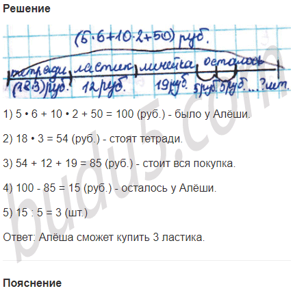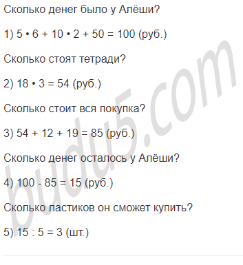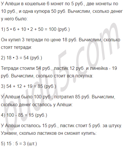 Задание № 4. У Алёши в кошельке 6 монет по 5 руб., две сонеты по 10 руб. и одна купюра 50 руб. Он купил 3 тетради по цене 18 руб., ластик за 12 руб. и линейку за 19 руб. На оставшиеся деньги он решил купить ластики. Сколько ластиков он сможет купить, если их цена 5 руб. за штуку?