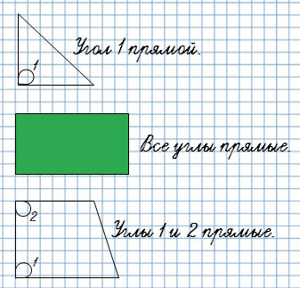 1. 1) Начерти в тетради треугольник с прямым углом, четырёхугольник, у которого все углы прямые, и четырёхугольник, у которого 2 угла прямые, а другие не прямые.