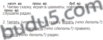 1. Читаю (наст. вр.) сказку, играл (прош. вр.) в шахматы, повторим (буд. вр.) правило, слушали (прош. вр.) радио.