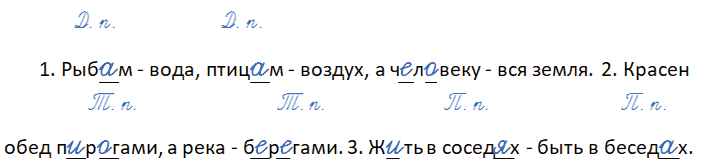 1. Рыбам (Д. п.) — вода, птицам (Д. п.) — воздух, а человеку — вся земля.