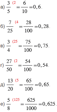 Чтобы преобразовать обыкновенную дробь в десятичную, ее нужно привести к новому знаменателю 10, 100 или 1000, используя основное свойство дроби (то есть умножив числитель и знаменатель дроби на такой дополнительный множитель, чтобы в знаменателе получилось 10, 100 или 1000), а затем записать полученную дробь с помощью запятой.
